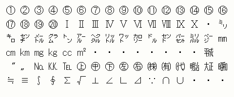 文字コードの規定にはなく,コードの空いているところに,パソコンメーカーが独自に割り当てた記号や漢字などをいいます。代表的なものに丸囲みの数字,ローマ数字,(株)などの略号,単位文字記号などがあります。下図が代表的な機種依存文字です。機種依存文字は「eメール」や「ホームページ」に使うことはできません。文字化けや文字抜けの原因になります。