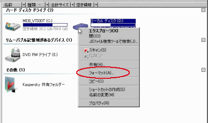 一般の方でも,データ専用に使っているハードディスクを一端初期化フォーマットして使いたい場合があります。このような場合は,マイコンピューターの該当ディスクのアイコンを右クリックして表示された右クリックメニューのフォーマットでおこないます。