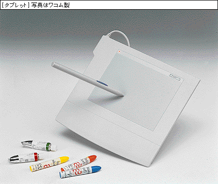 A4サイズ前後の板状の感知装置と入力指示をするペン型の器具(スタイラスペン)がセットになった入力装置です。主にCADなど精密な入力が必要な作業で使われているが,ペンで描画する感覚で操作できるため,フォトレタッチやイラスト作成などの用途でも使います。最近は,情報端末機器の手書き入力装置として使われています。