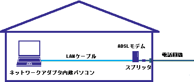 ADSL回線の利用が可能になったら,モジュラージャックにスプリッタを接続し,スプリッタのMODEMUなどの表記のあるジャックとADSLモデムを接続し,PHONEとある方は電話機を接続します。これらの配線は通常の電話モジュラーケーブルでおこないます。ADSLモデムとパソコン間はLANケーブルでパソコンのLANボード(カード)のジャックに接続することになります。